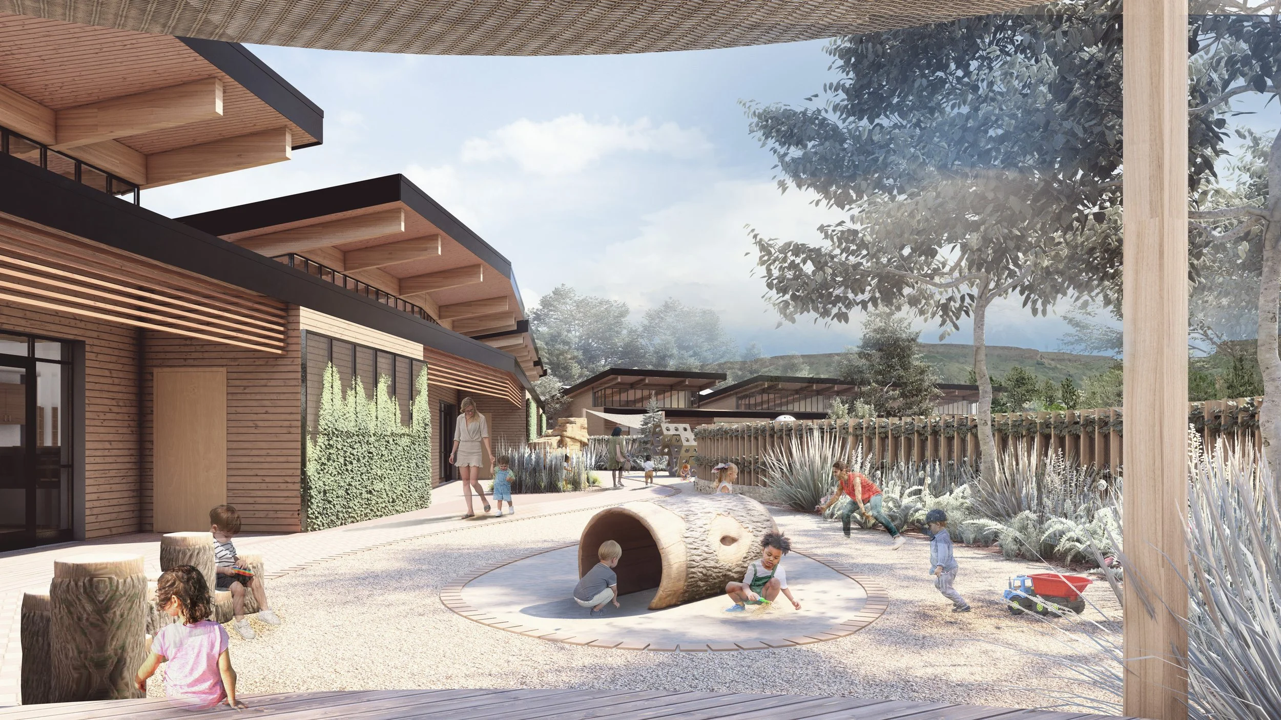 At full build-out, the proposed ECE Center would have served children from infant through preschool, with classrooms opening directly onto natural outdoor play spaces. The design featured warm, durable materials, ample daylighting, and layered security to meet both regulatory standards and campus expectations. A prominent entry, shared community space, and staff work zones were envisioned to create a welcoming, professional environment.